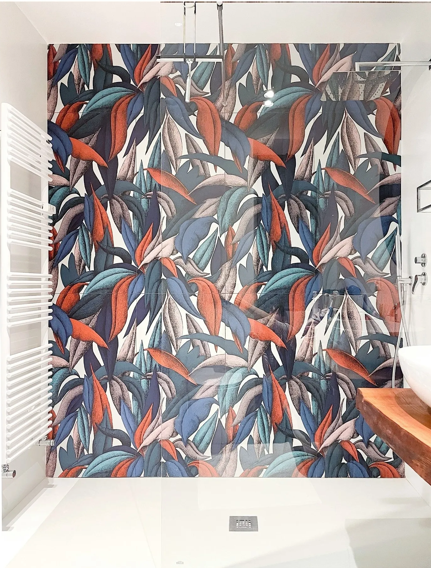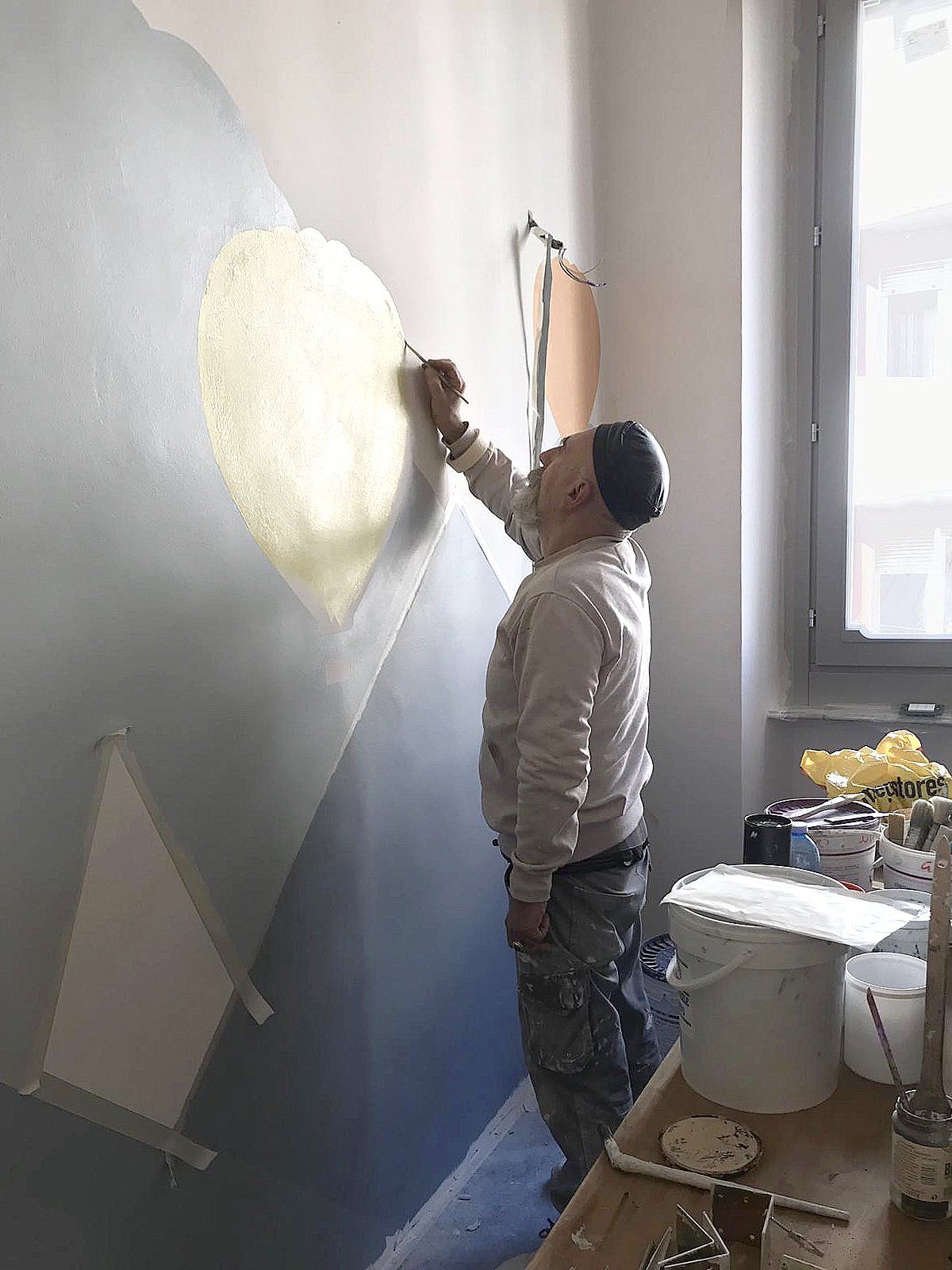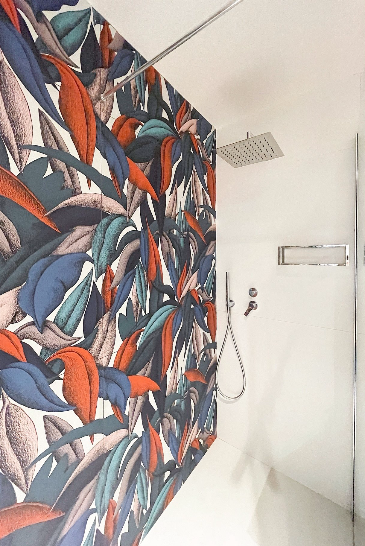 Uno spazio abitato vivo e colorato per Claudia e Davide che hanno una splendida fioreria nel centro di Torino. Il loro appartamento aveva degli alti soffitti voltati nascosti da un controsoffitto, una cucina piccola e un bagno stretto e lungo. La ristrutturazione ha fatto spazio ad un volume centrale colorato che contiene i servizi: bagni, cucina e lavanderia. Sfruttando le altezze, tra il volume e la volta delle piante sempre verdi rendono l'ambiente vivo. Per i bagni grafiche floreali e colorate e piani lavabo in legno grezzo. Il piccolo Tommaso felice del suo dipinto con verdi montagne e mongolfiere che volano leggere.