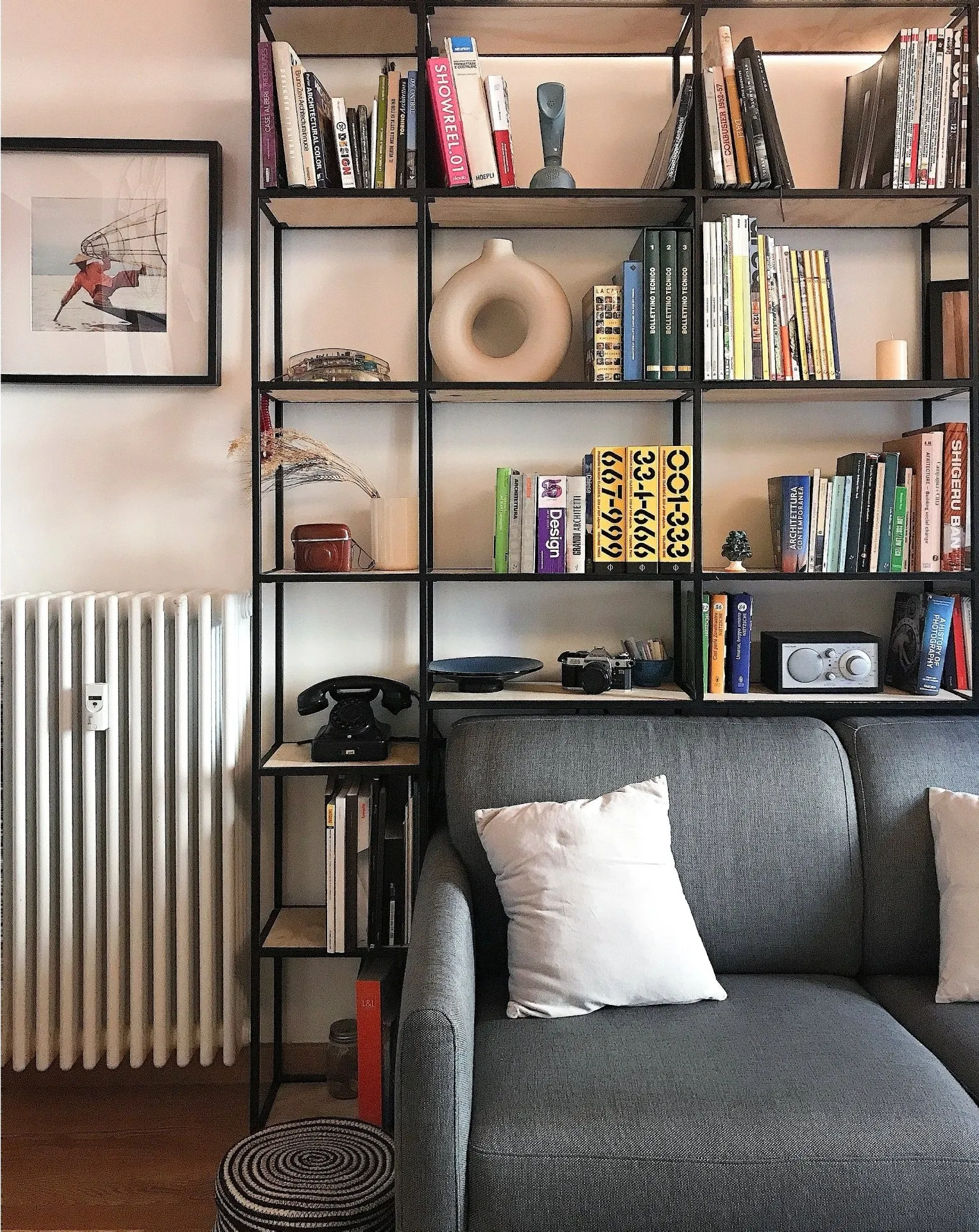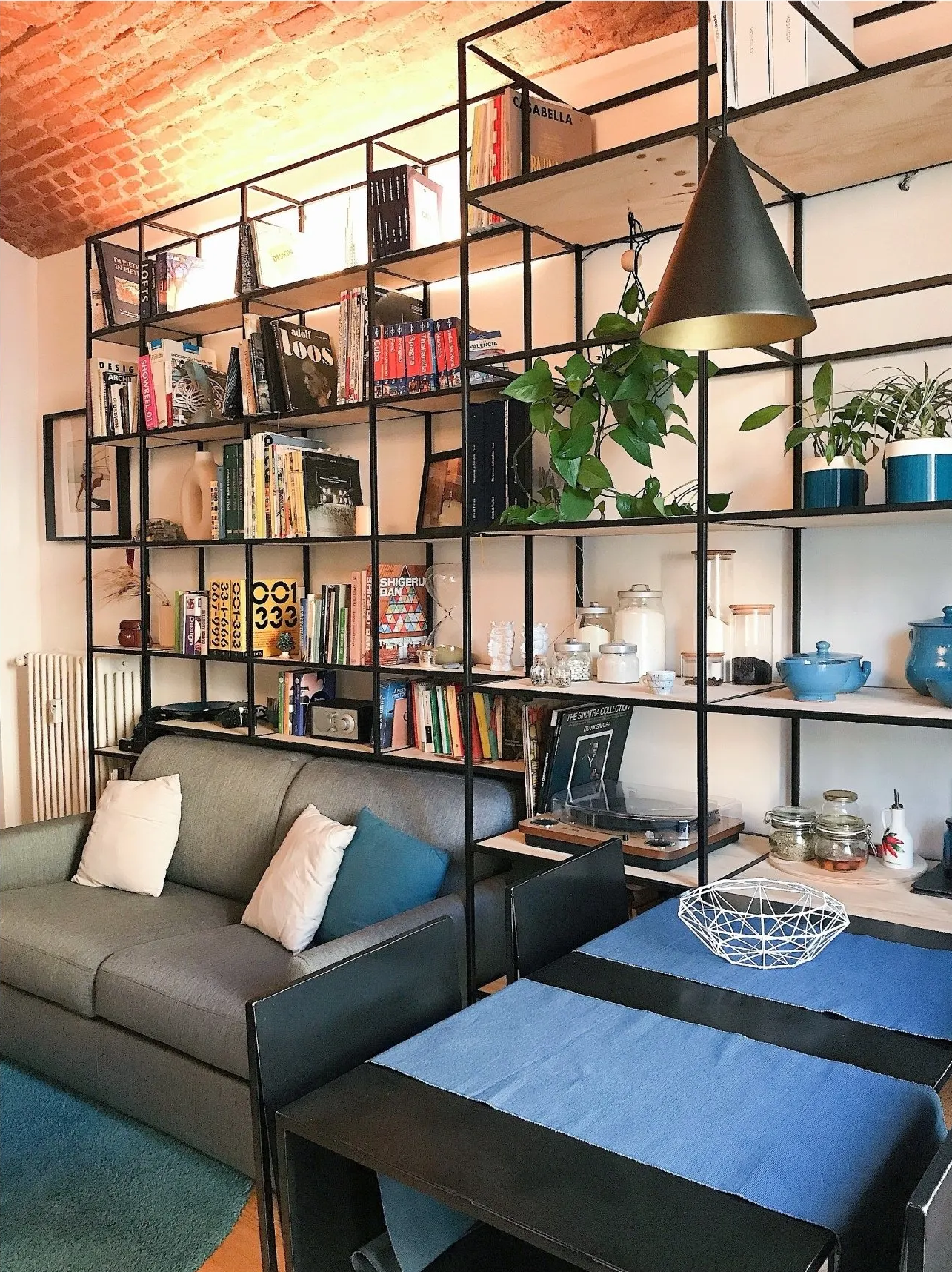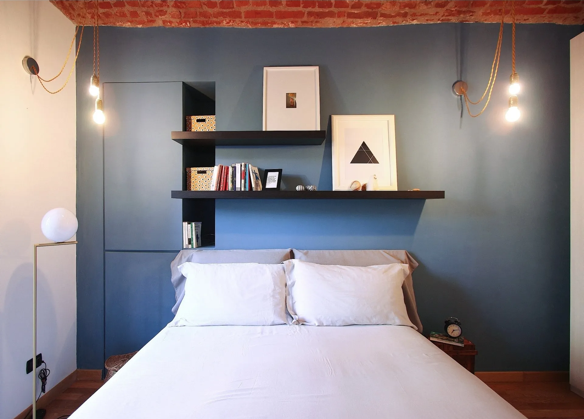 Uno spazio abitato con ingresso, cucina, soggiorno, camera da letto, camera degli ospiti, studio, disimpegno, bagno e ripostiglio in soli 35 mq? Si, è possibile! Di tutto questo aveva bisogno Giuseppe, tutto in due stanze. Ingresso su cucina-soggiorno con divano letto per gli ospiti e una capiente libreria per il suo studio, con dei grandi cassettoni per le stoviglie della cucina, un tavolo per 4 persone ma piccolo e leggero per spostarlo facilmente e ottenere diverse configurazioni dello spazio. Una camera da letto con letto contenitore e capienti armadi ad incasso, disimpegno, bagno e un piccolo ripostiglio lavanderia. Il tutto coronato da soffitti voltati con mattoni faccia vista e pavimento di caldo parquet.