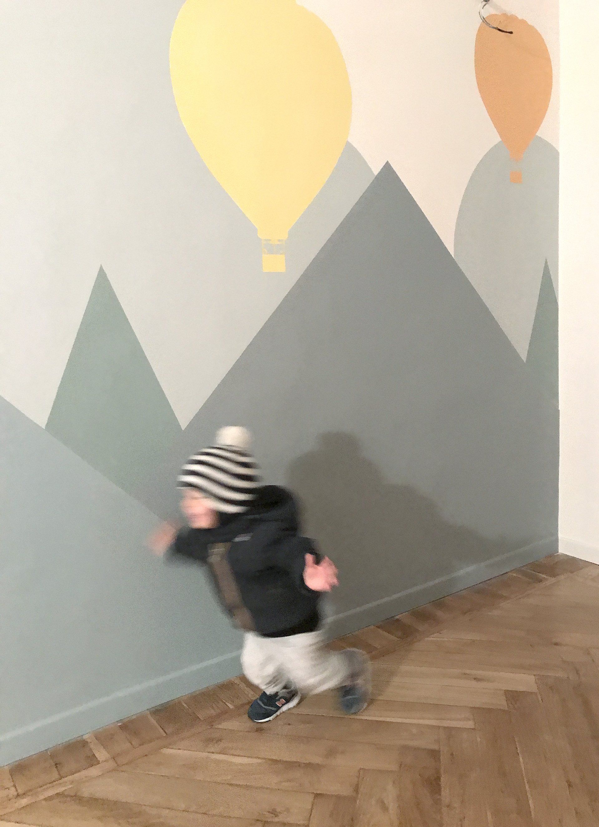 Uno spazio abitato vivo e colorato per Claudia e Davide che hanno una splendida fioreria nel centro di Torino. Il loro appartamento aveva degli alti soffitti voltati nascosti da un controsoffitto, una cucina piccola e un bagno stretto e lungo. La ristrutturazione ha fatto spazio ad un volume centrale colorato che contiene i servizi: bagni, cucina e lavanderia. Sfruttando le altezze, tra il volume e la volta delle piante sempre verdi rendono l'ambiente vivo. Per i bagni grafiche floreali e colorate e piani lavabo in legno grezzo. Il piccolo Tommaso felice del suo dipinto con verdi montagne e mongolfiere che volano leggere.